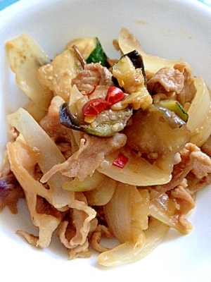 豚バラと茄子とズッキーニと玉ねぎの味噌胡麻辣油炒め けいたい日記